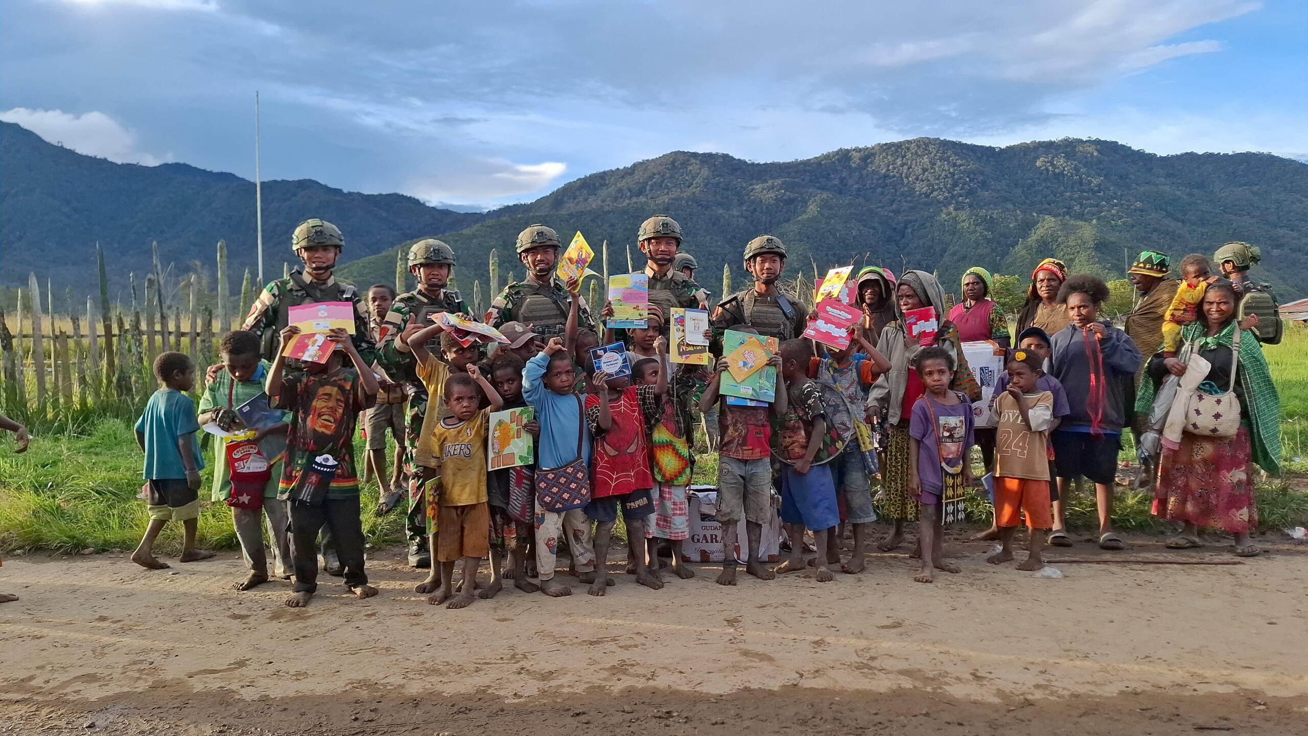 Papua, PW: Dispen Kormar TNI Angkatan Laut (Papua Tengah). Prajurit Satuan Tugas (Satgas) Pengamanan Perbatasan (Pamtas) RI-PNG Mobile 2025 Gobang V Batalyon Infanteri (Yonif) 4 Marinir, mengabdi dengan hati di pelosok negeri menghadirkan kegembiraan dengan melaksanakan Bakti Sosial membagikan berbagai perlengkapan sekolah kepada anak-anak dan remaja asli Papua, bertempat di Obano Distrik Paniai Barat, Kabupaten Paniai, Papua Tengah, Kamis (09/04/2026).