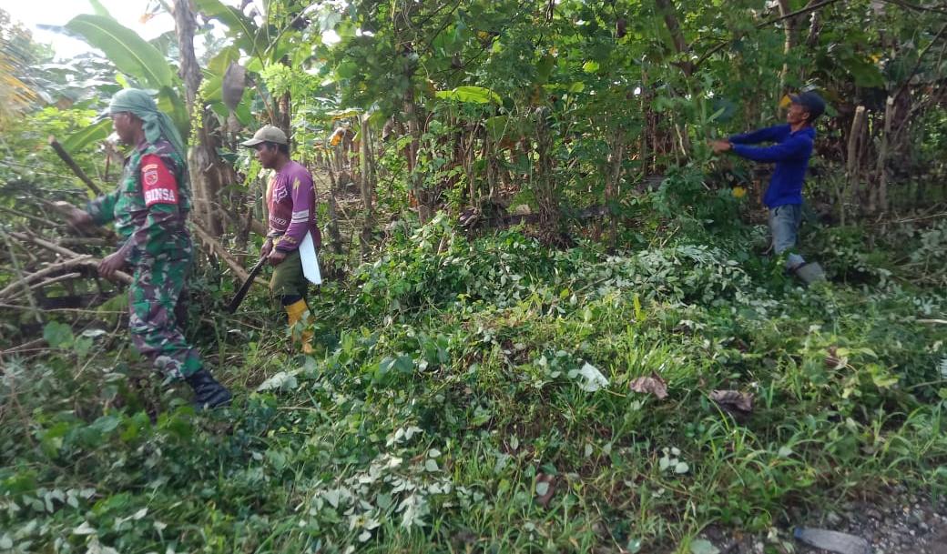 Babinsa bersama warga tampak kompak membersihkan sampah di sepanjang jalan, selokan, serta pekarangan rumah warga.