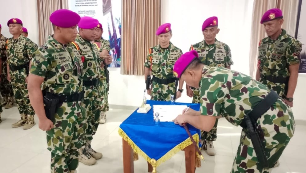 Dispen Kormar, TNI AL (Situbondo) PW : Komandan Komando Latihan Marinir (Dankolatmar) Brigjen TNI (Mar) Agus Dwi Laksana Putra., memimpin langsung acara Serah Terima Jabatan (Sertijab) Komandan Pusat Latihan Pertempuran Marinir (Danpuslatpurmar) 5 Baluran yang di gelar di Gedung Ruang Rapat Puslatpurmar 5 Baluran. Situbondo, Senin (13/04/2026).