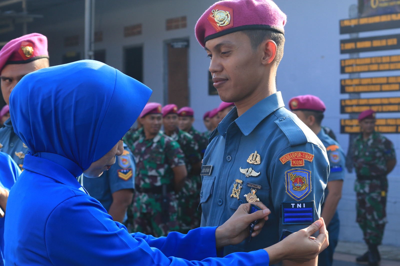 Pada penyematan pangkat kali ini, selain penyematan tanda pangkat langsung oleh Danyon Komlek 1 Mar, prajurit yang naik pangkat disematkan tanda pangkat oleh para istri prajurit yang naik Pangkat.