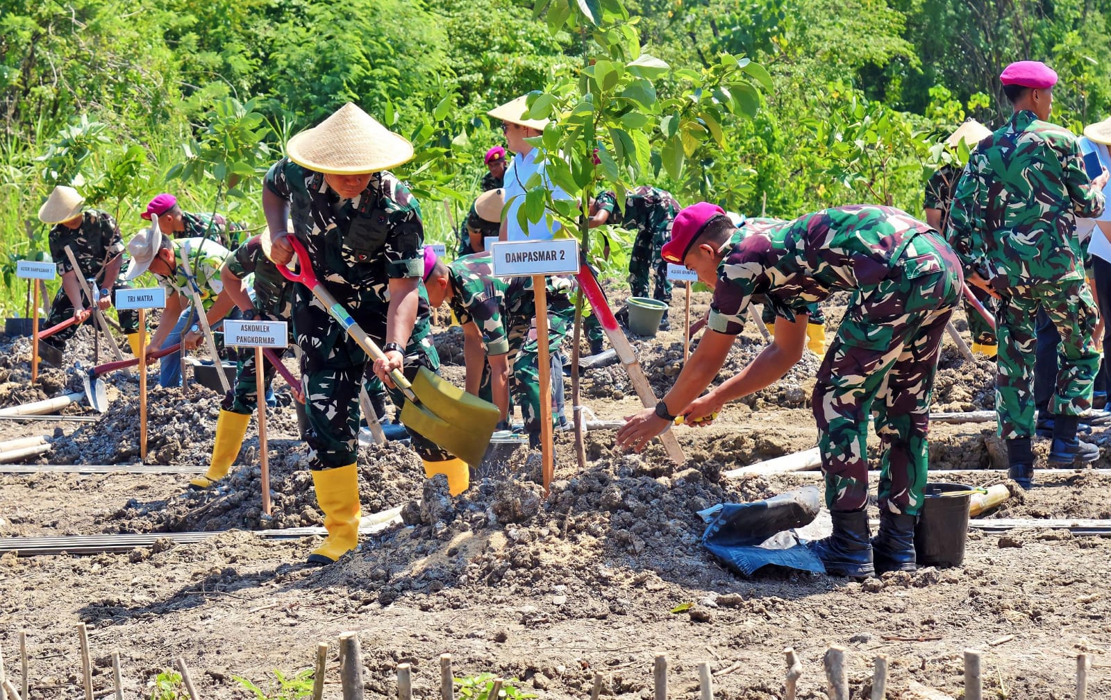 Dispen Kormar TNI Angkatan Laut (Surabaya) PW : Panglima Korps Marinir (Pangkormar) Letnan Jenderal TNI (Mar) Dr. Endi Supardi, S.E., M.M., M.Tr.Opsla., CHRMP., CRMP., didampingi Ketua Gabungan Jalasenastri Korps Marinir Ny. Nana Endi Supardi, memimpin penanaman pohon Alpukat dan Jambu Air pertama, di Lahan Ketahanan Pangan Kebun Alpukat, Kesatrian Marinir Soetedi Senaputra, Karang Pilang, Surabaya. Kamis (16/04/2026).
