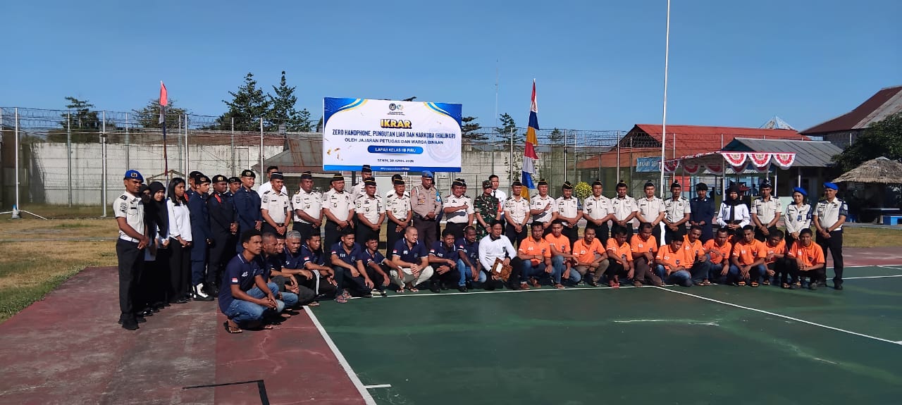 SBB PW Komandan Koramil (Danramil) 1513-01/Piru, Kapten Inf Nico Slarmanat, menghadiri kegiatan penandatanganan Ikrar Halinar (Handphone, Pungli, dan Narkoba) yang berlangsung di Lembaga Pemasyarakatan (Lapas) Piru, Jalan Trans Seram, Desa Piru, Kecamatan Seram Barat, Kabupaten Seram Bagian Barat, pada Senin (20/4/2026).