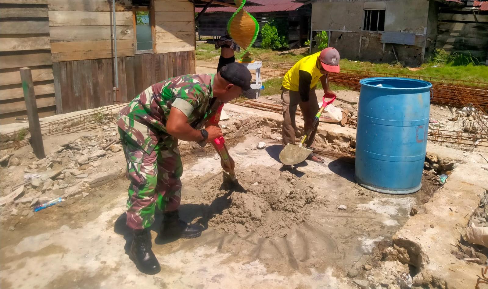 Dalam kegiatan tersebut, Babinsa turut membantu Bapak Corneles Matanase dalam proses pembangunan rumah, khususnya pada tahap pencampuran semen untuk pembuatan pondasi.