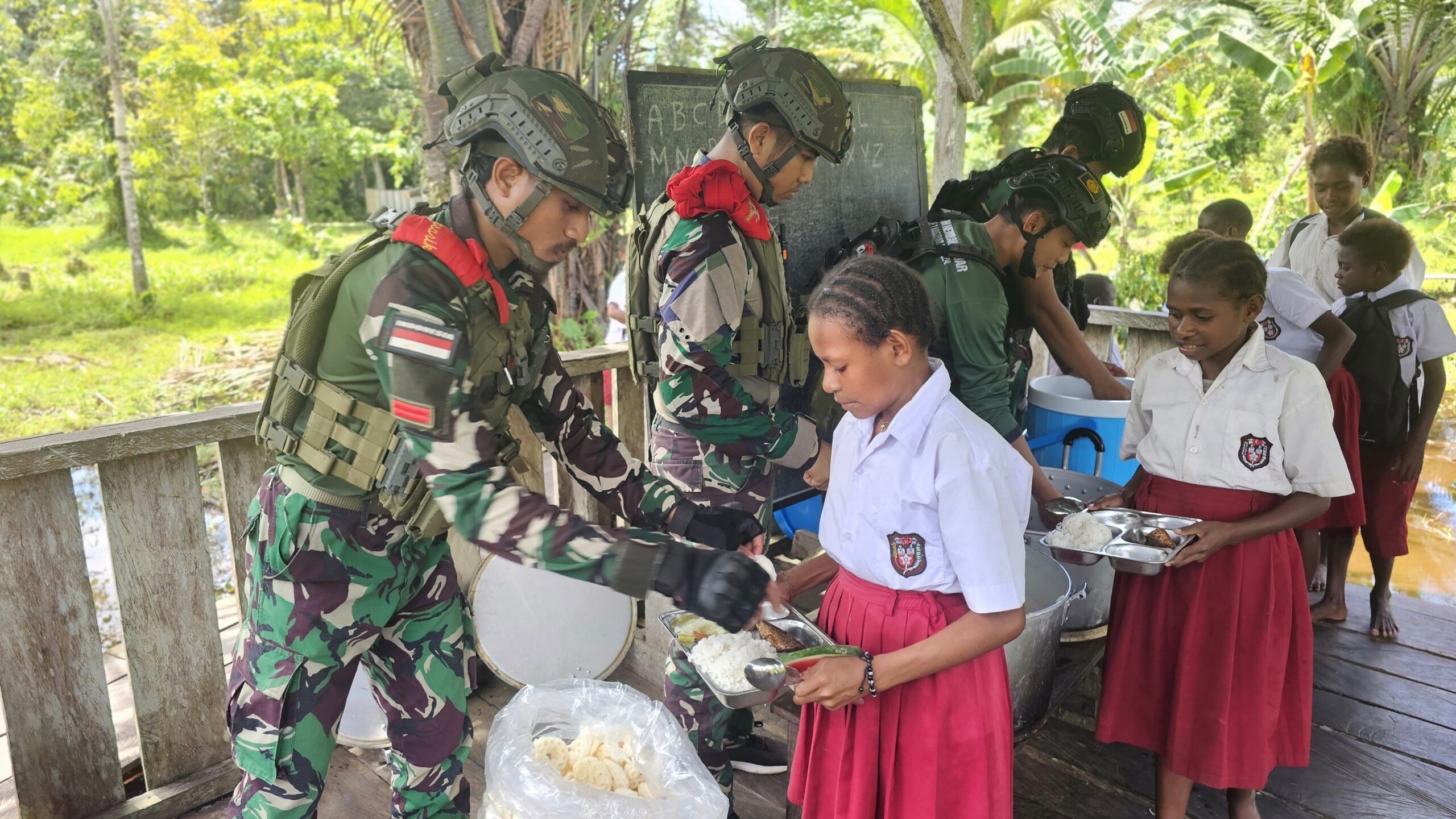 Papua PW 25 Agustus 2025 – Satuan Tugas Pengamanan Perbatasan (Satgas Pamtas) Mobile Yonif 733/Masariku menggelar program “Masariku Peduli Gizi” di SD Rimba Mumugu, Distrik Sawa ERma, Kabupaten Asmat. Kegiatan ini merupakan wujud kepedulian prajurit Masariku terhadap kesehatan dan gizi anak-anak di wilayah perbatasan. Program ini menyasar anak-anak usia sekolah dasar dengan memberikan makanan bergizi gratis. Menu yang disajikan meliputi nasi, lauk pauk bergizi seperti ayam atau ikan, sayuran, serta buah-buahan. Selain itu, tim kesehatan dari Satgas Pamtas Mobile Yonif 733/Masariku juga memberikan edukasi tentang pentingnya gizi seimbang bagi…