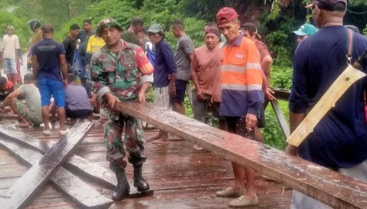 SBB PW Dalam rangka menjaga kebersamaan dan semangat gotong royong, Anggota Koramil 1513-01/Piru, Babinsa Desa Kaibobo Kecamatan Seram Barat, Sertu Daniel Teftutul bersama beberapa anggota lainnya melaksanakan kegiatan Jumat Berkah dengan mengajak masyarakat melaksanakan kerja bakti memperbaiki Jembatan Makputi, Jumat (22/8/2025). Jembatan Makputi merupakan akses vital yang menghubungkan pusat kota Kecamatan Seram Barat dengan Desa Kaibobo. Kondisi jembatan yang mulai mengalami kerusakan akibat usia pemakaian dan curah hujan yang tinggi, membuat mobilitas masyarakat sedikit terhambat. Oleh karena itu, perbaikan jembatan dilakukan secara swadaya bersama aparat TNI dan warga setempat.…